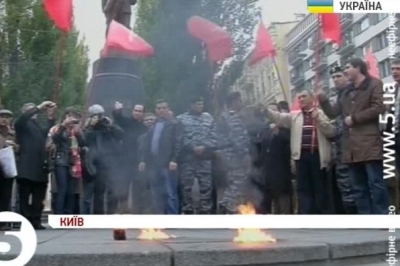 У середмісті Києва вони проводили акцію «народний мікрофон». Зв'язок її із маршем «Свободи» з нагоди річниці Української повстанської армії - вони заперечують. Хоч повідомили про мітинг лише опівдні. Коли колона «свободівців», які прямували на власний мітинг, проходила повз монумент Леніну, зав’язалася сутичка. Коли ж правоохоронці розборонили супротивників, комуністи привселюдно спалили червоно-чорний прапор УПА. За результатами бійки - нікого не заарештували.