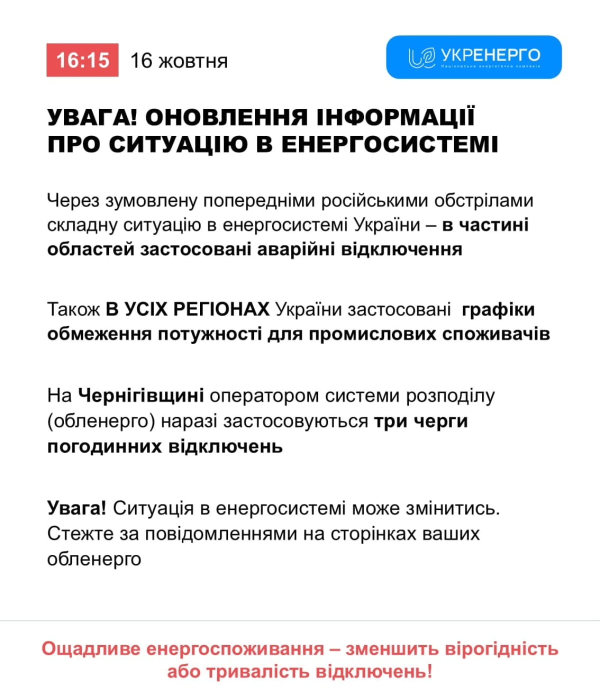В "Укренерго" заявили, що в Україні діятимуть аварійні відключення електроенергії, а до кінця доби, 16 жовтня, діятимуть обмеження потужностей для промислових споживачів.