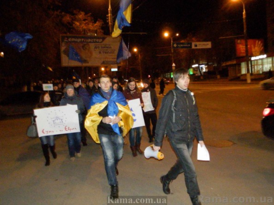 Студентка університету Ольга Марченко розповіла, що першочергово студенти збирались покричати гасло "Єдина Україна! Единая страна!" з балконів своїх гуртожитків, проте ректор університету попросив не робити цього на території проживання студентів, після подібного флеш-мобу за день до цієї події. Тому студенти вирішили влаштувати марш сумськими вулицями.