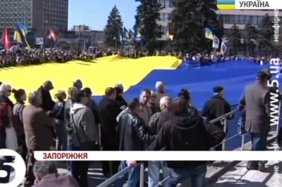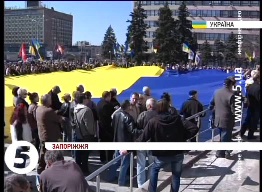 Проукраїнський мітинг зібрав понад тисячу активістів. Вони розгорнули 35-метровий прапор України, як символ того, що Запоріжжя є українським містом. Учасники акції кажуть – не потребують допомоги російських військ. Водночас, проросійськи налаштованих активістів було вдесятеро менше – близько сотні. Учасники висловлювали незадоволення теперішньою владою та вимагали референдуму.