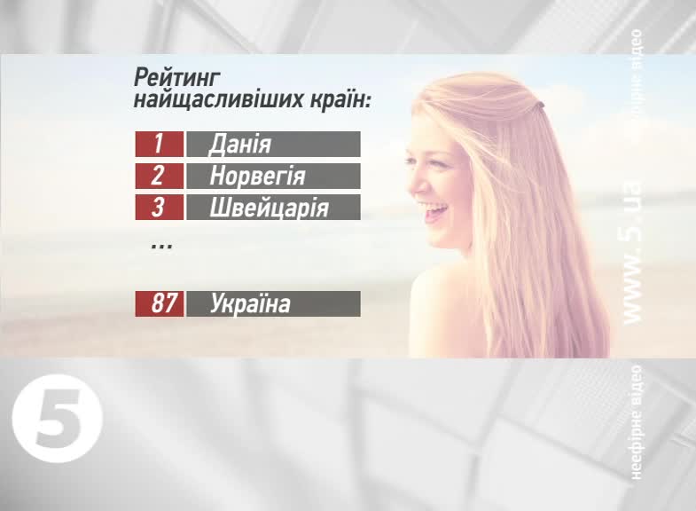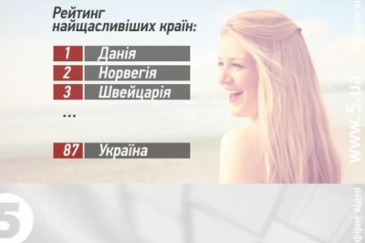 Лідирують у рейтингу Данія та Норвегія. Менш щасливими є мешканці Швейцарії, Нідерландів та Швеції. Загалом, у переліку - понад 150 країн. Фахівці оцінювали рівень економічного розвитку, тривалість життя, можливість покластися на когось у найближчому оточенні, суб`єктивний ступінь свободи в ухваленні життєвих рішень, захищеність від корупції та щедрість. До першої десятки щасливих країн потрапили також Канада, Фінляндія, Австрія, Ісландія та Австралія. А в кінці списку - країни Африки, зокрема - Гвінея і Танзанія.