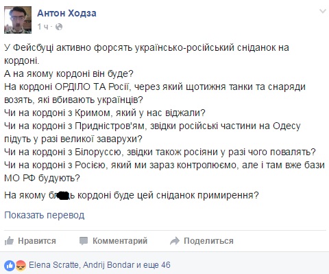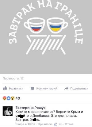 Під "сніданками" депутат має на увазі проштовхування через соцмережі так званої "примирливої акції" у Skype "Сніданок на кордоні" між українцями і росіянами, уточнює видання "Апостроф". Ця акція, ініціатива якої начебто походить від росіянки з Нижнього Тагілу Ольги Полякової, має відбутися 9 травня з 9:00 до 10:00 за московським часом. Українці в соціальних мережах на неї відреагували вкрай негативно.