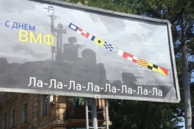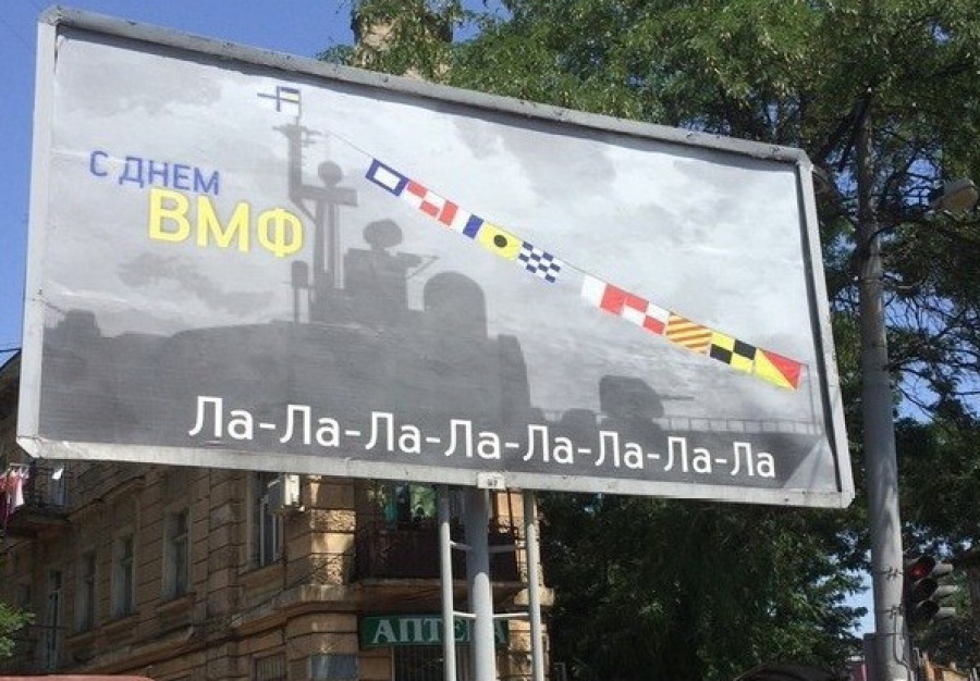 Одесити ж у свій спосіб привітали моряків з професійним святом. У різних районах міста з'явилися білборди з написом "З днем ВМС" та девізом "Ла-ла-ла-ла-ла". На малюнку – кольорові прапорці, за допомогою яких знавці морського коду можуть прочитати рядок з популярної пісні про президента сусідньої держави.