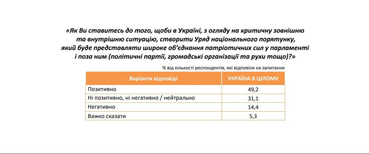 Ініціативу створення в Україні Уряду національного порятунку позитивно сприймають 49,2% респондентів. Ще 31,1% ставляться до цієї ідеї нейтрально, а 14,4% виступають проти.