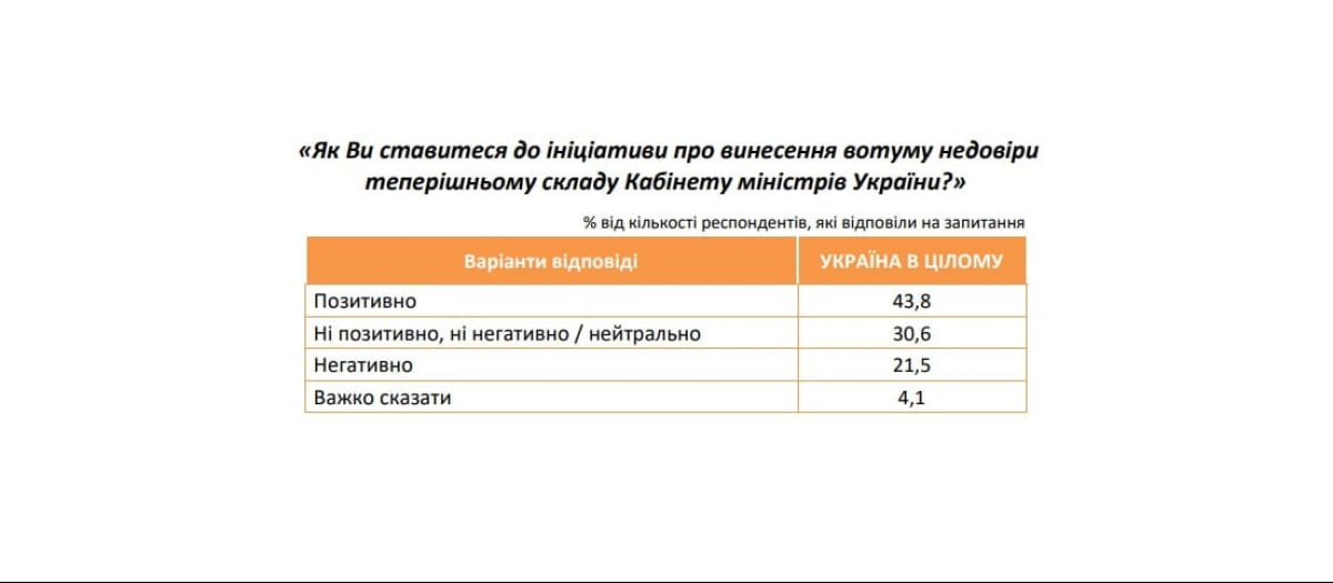 За результатами дослідження, 43,8% українців позитивно оцінюють ініціативу щодо винесення вотуму недовіри чинному Кабміну. Соціологи відзначають, що така позиція може відображати "незадоволеність частини громадян діями виконавчої влади та очікування більш ефективних рішень".