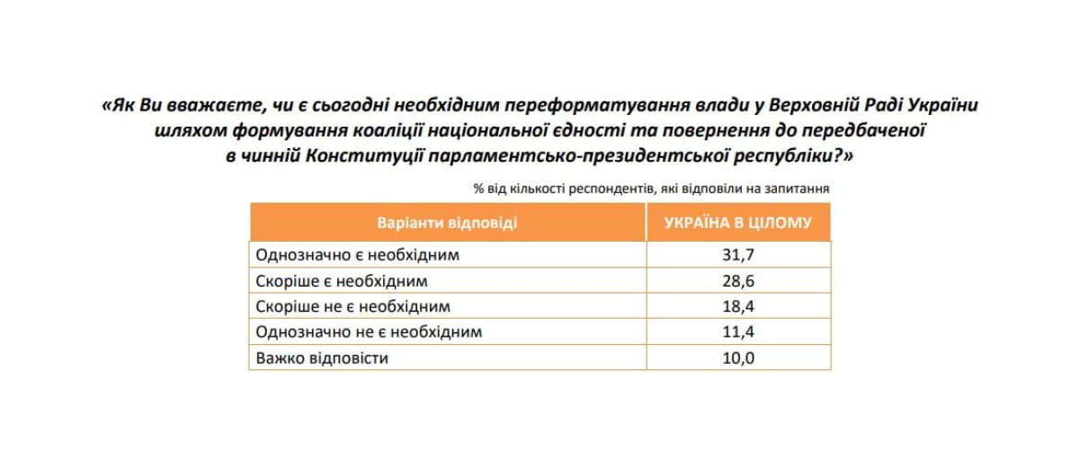 Більшість опитаних – 60,3% – підтримують переформатування парламентської більшості через створення коаліції національної єдності та повернення до парламентсько-президентської моделі.