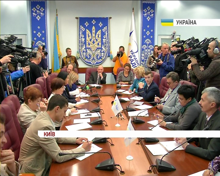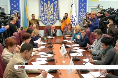 У прес-центрі національної радіокомпанії облаштували імпровізовану аудиторію. За партами письменники, журналісти та священик, які зголосились написати диктант з української мови під наглядом відео камер.