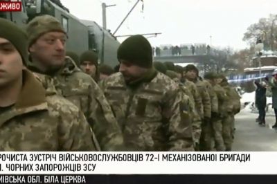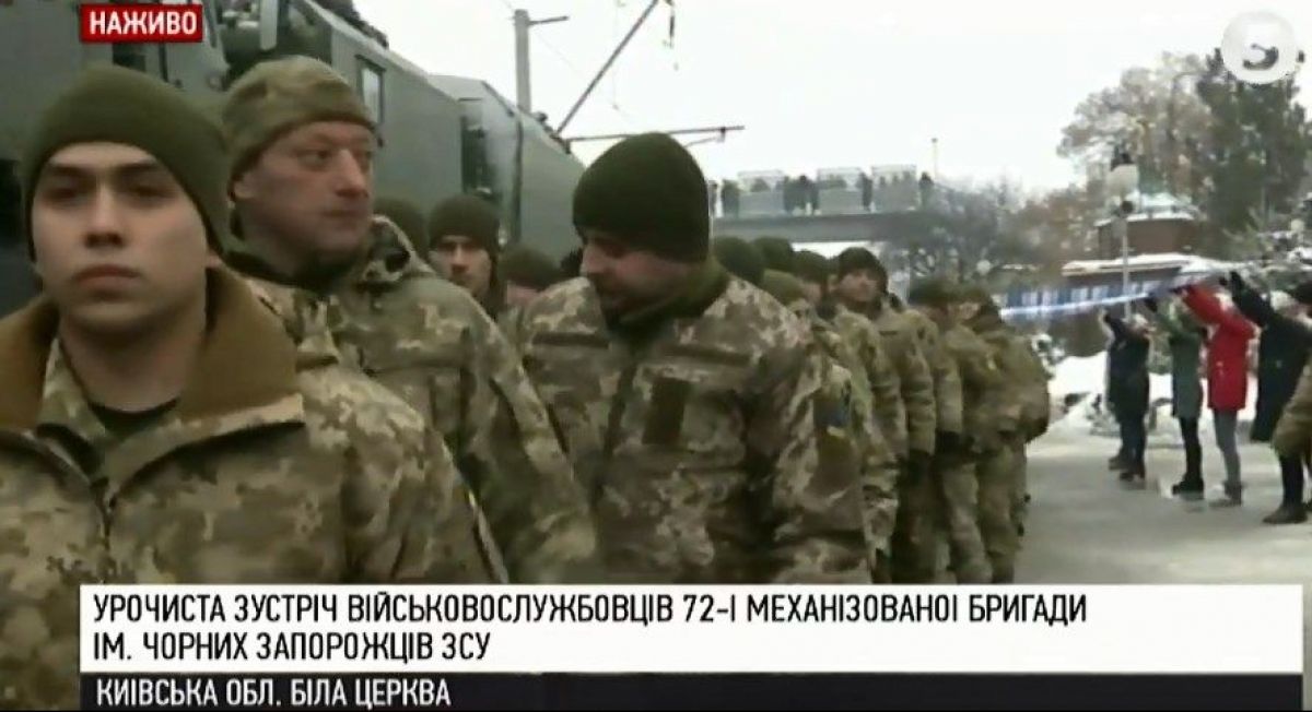 "5 канал" транслював урочисту зустріч в Білій Церкві військовослужбовців 72-ї механізованої бригади ім. Чорних Запорожців ЗСУ за участі Президента України.