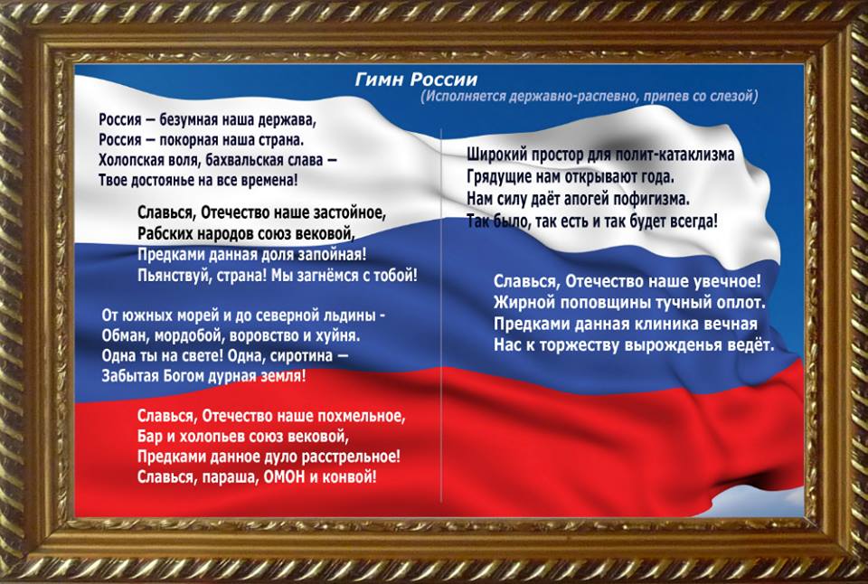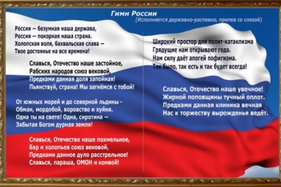 Як повідомляв 5.ua, 9 квітня 2016 року в Севастополі на "губернаторському" з'їзді висміяли гімн РФ - "Россия – безумная наша держава". При цьому безсмертна музика Соловйова-Сєдого супроводжувалася "дисонансними нотами упереміш із дзвоновою какофонією". Зауважимо, що в Росії передбачена кримінальна відповідальність тільки за наругу над державними прапором і гербом. За наругу над гімном застосовується адміністративне покарання. Після того, що сталося в Севастополі в Держдумі Росії пропонують ввести кримінальну відповідальність і за образу російського гімну.