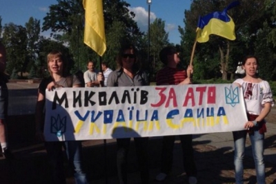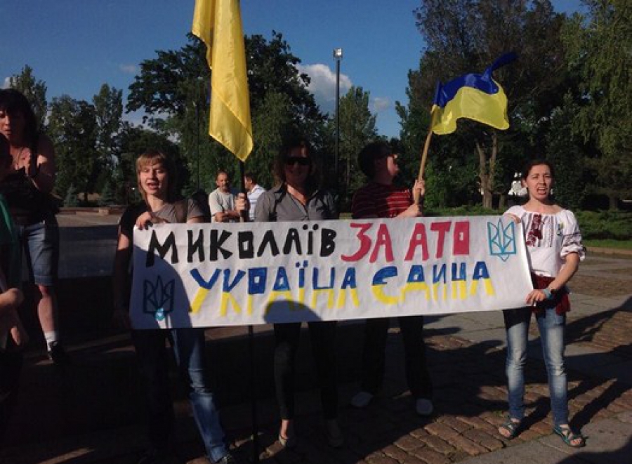 Згідно з повідомленням, активісти зібралися біля пам'ятника Героям-ольшанцям на головній площі Миколаєва, щоб не дозволити проросійськи налаштованим миколаївцям провести свій мітинг із закликом припинити антитерористичну операцію на Сході країни.