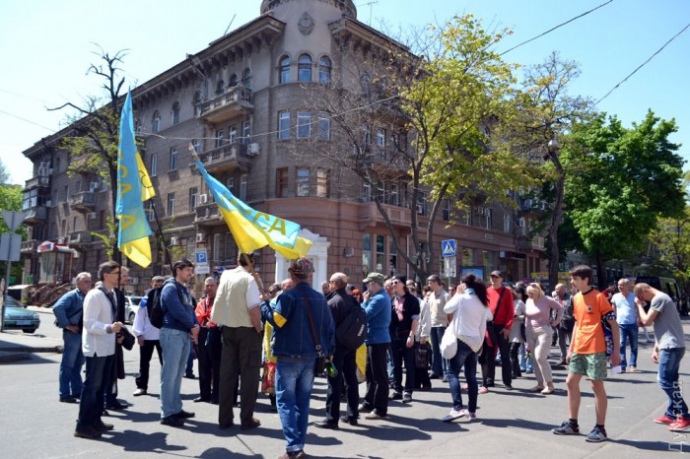 Люди прийшли на перехрестя вулиць Дерибасівської та Преображенської, щоб покласти квіти на місці загибелі активістів Майдану Ігоря Іванова та Андрія Бірюкова, яких застрелили 2 травня 2014 року проросійські бойовики.