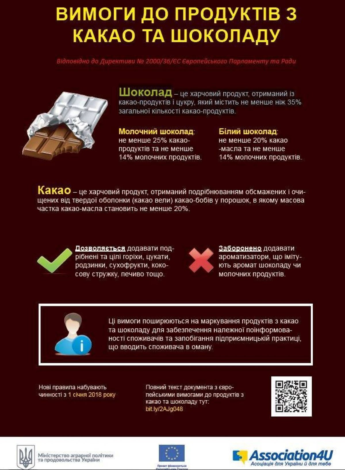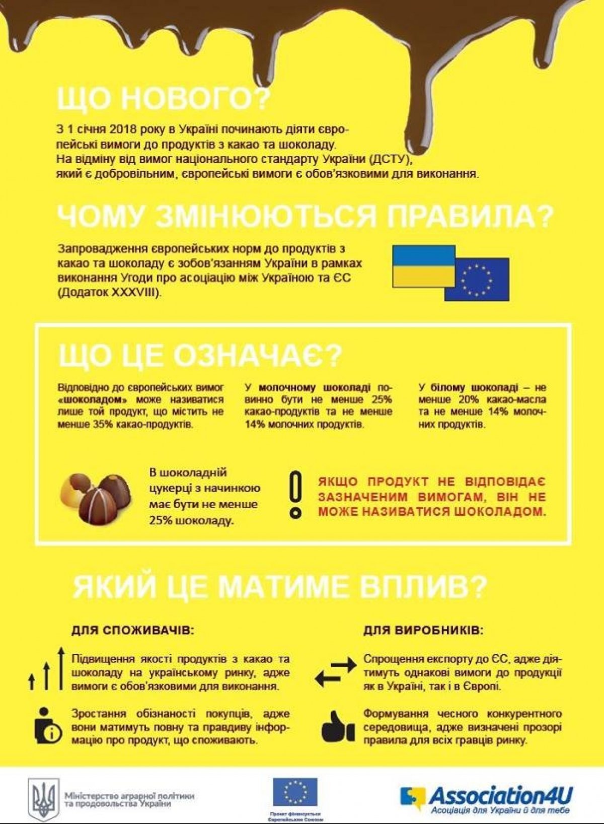З 1 січня в Україні почали діяти нові вимоги до виробів з какао та шоколаду, що мають забезпечити дотримання європейських стандартів у галузі безпечності та якості продуктів харчування.