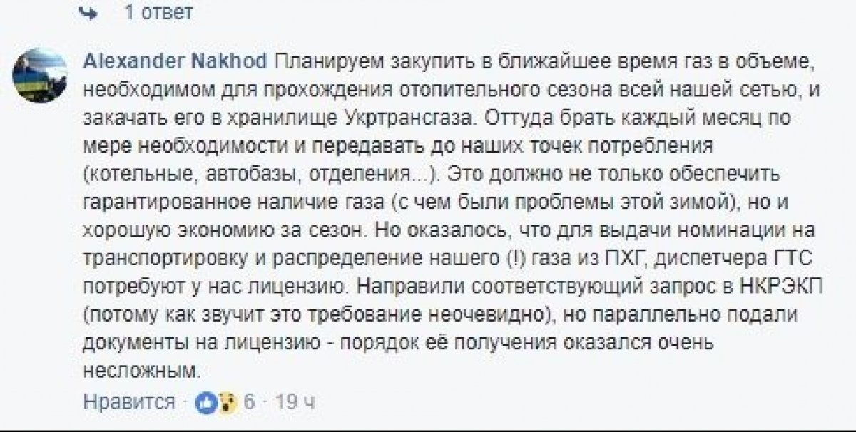 За його словами, газ необхідно закачати в сховище "Укртрансгазу" і звідти брати щомісяця в міру необхідності і передавати до точок споживання (котельні, автобази, відділення). Він також припустив, що це повинно не тільки забезпечити гарантовану наявність газу, але й гарну економію за сезон.