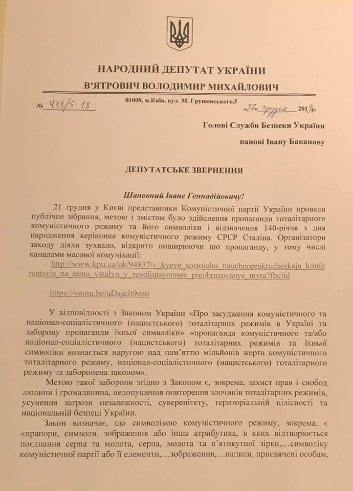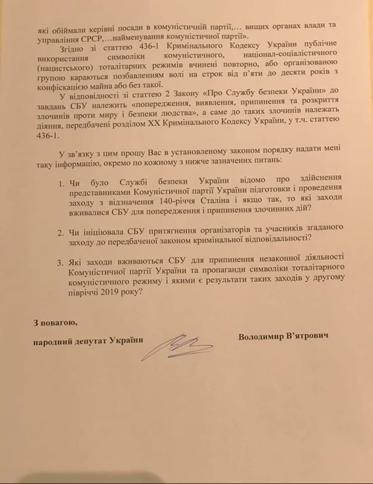 "Чи було Службі безпеки України відомо про здійснення представниками Комуністичної партії України підготовки і проведення заходу з відзначення 140-річчя Сталіна, і якщо так, то які заходи вживало СБУ для запобігання і припинення злочинних дій? Чи ініціювала СБУ притягнення організаторів та учасників згаданого заходу до передбаченої законом кримінальної відповідальності? Які заходи вживає СБУ для припинення незаконної діяльності Комуністичної партії України та пропаганди символіки тоталітарного комуністичного режиму і якими є результати таких заходів у другому півріччі 2019 року?" – запитує В'ятрович.