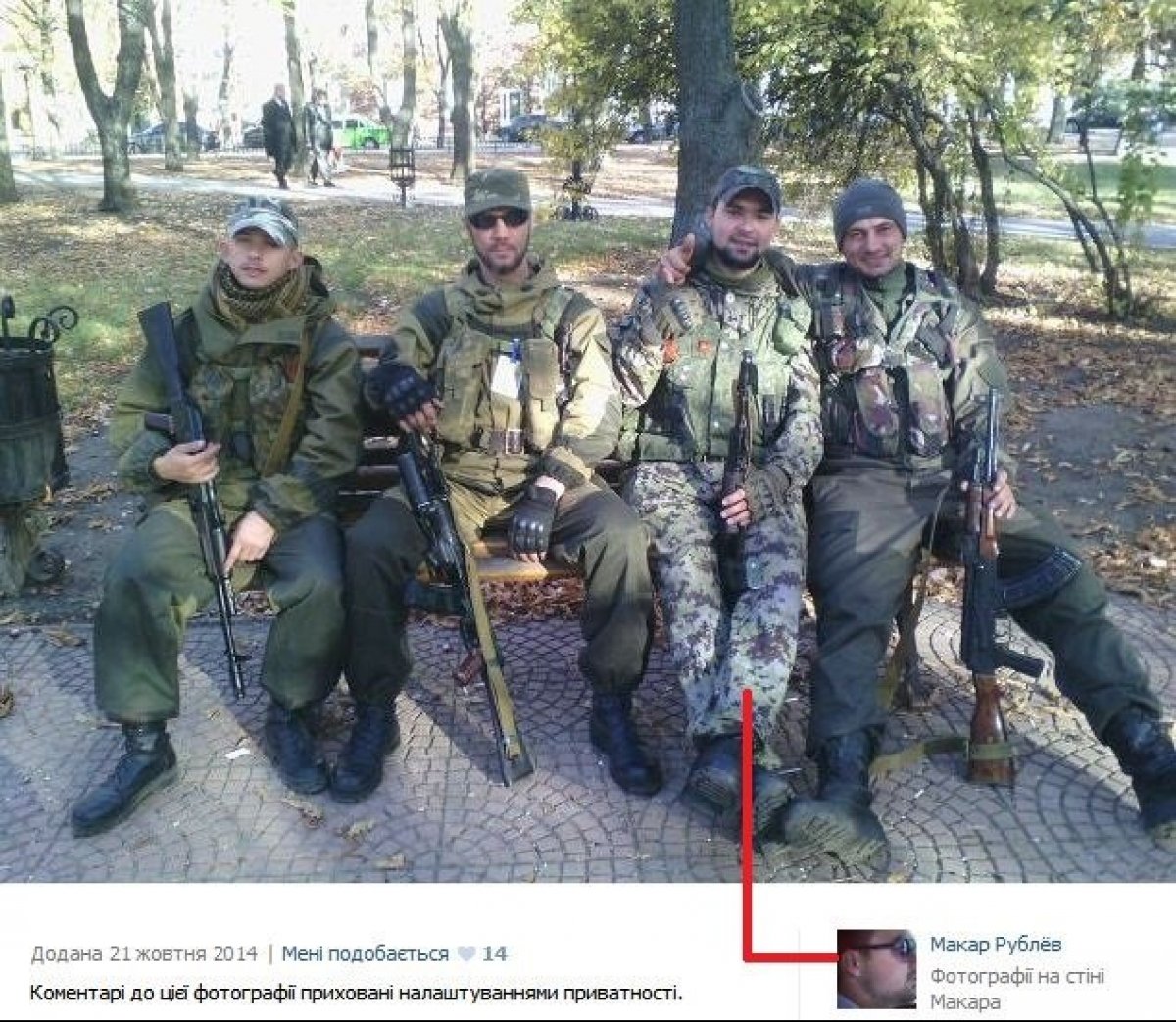 "Ми вийшли на слід його матері Макарової-Дьоміної - VK1, VK2 і ОК (архіви профілю, загального альбому і сімейного альбому, контактів), вона й надала нам інформацію, якої бракувало: Брати участь в бойових діях Макаров, припускаємо, почав у жовтні-листопаді 2014 року, коли він по лінії "казачества" опинився на Донбасі в лавах незаконних збройних формувань так званої "Новоросії". В одному з профілів Макарова записано, що він студент вишу ім. Даля (Східноукраїнський національний університет імені Володимира Даля, окупований Луганськ, Україна). "Студентство" Макарова в Луганську проходило в лавах бандформування "Мангуст" - це так звана "рота спецпризначення" у складі "батальйону "Заря". За час перебування в Луганській області Макаров встиг попозувати на руїнах разом з представниками моніторингової місії ОБСЄ", - визначили розслідувачі.