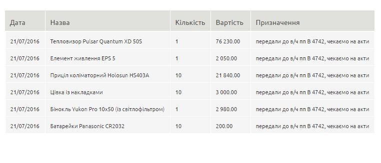 "Гроші зібрані через платформу People’s Project завдяки благодійним внескам людей, які підтримують проект "Оперативне реагування", та їх активності в соцмережах. Також окремі благодійники роблять негрошові внески – передають оптику та інші корисні речі для військових. Всі прилади офіційно передаються на баланс військової частини ПП В4742 і вже стануть до роботи", – мовиться на сайті.