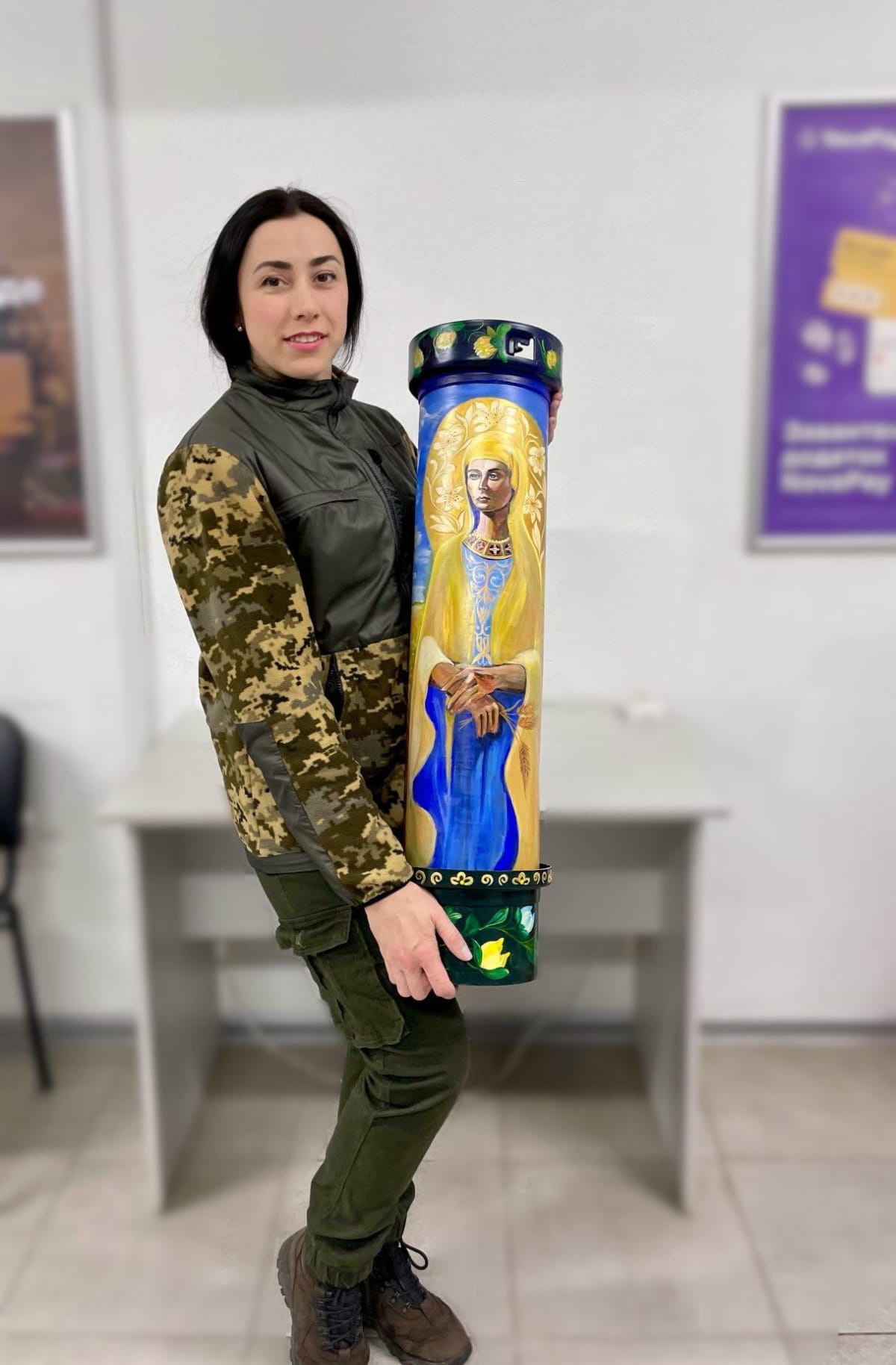 Волонтери відреагували миттєво і тепер у нашій редакції є справжній колекційний тубус "Берегиня" від порохового снаряда 155-мм калібру, що розписала художниця Оксана Кириченко.