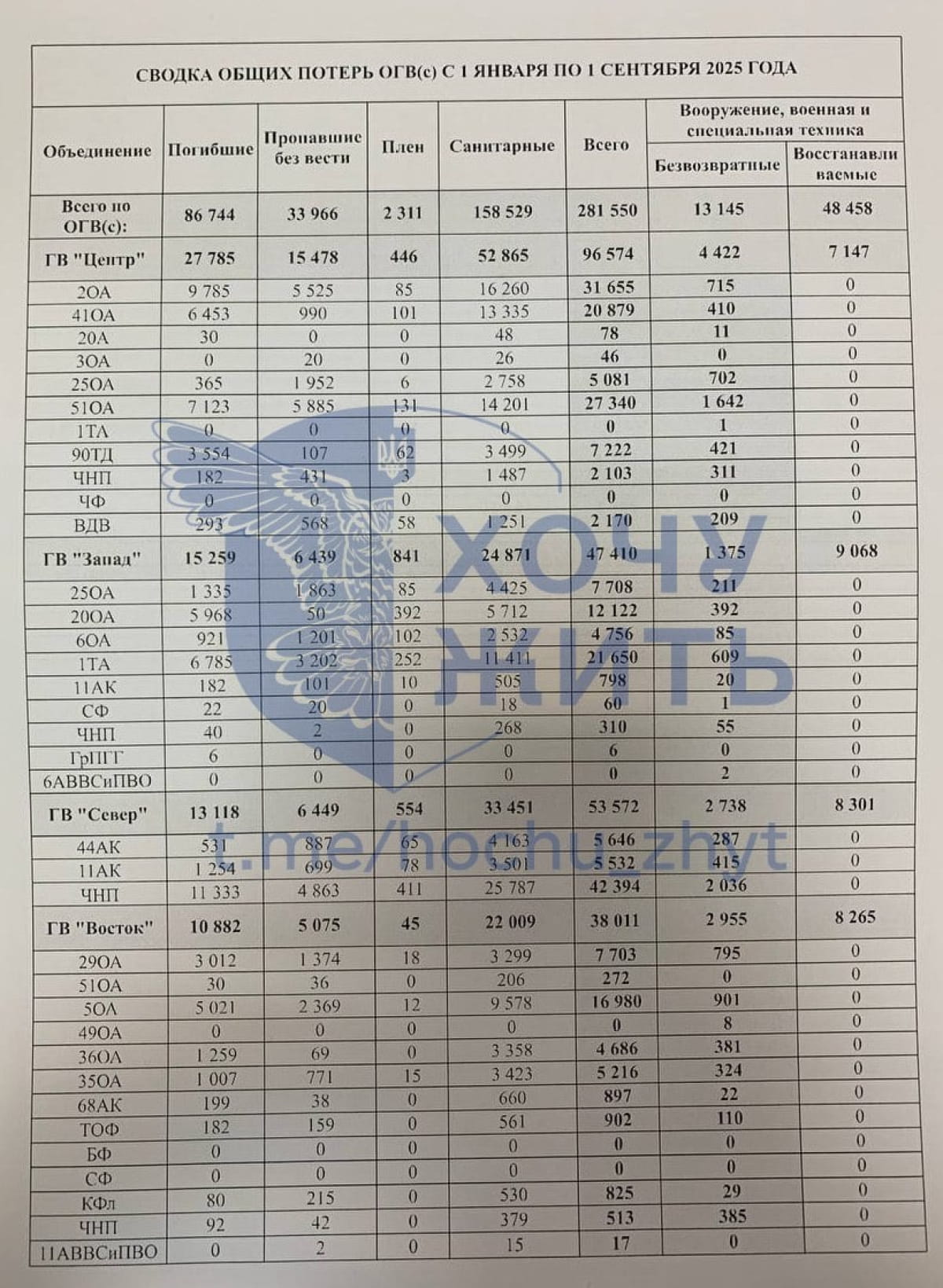 За даними проєкту "Хочу жить", протягом січня-серпня 2025 року російська армія втратила 281 550 військовослужбовців: убитими, пораненими та зниклими безвісти.