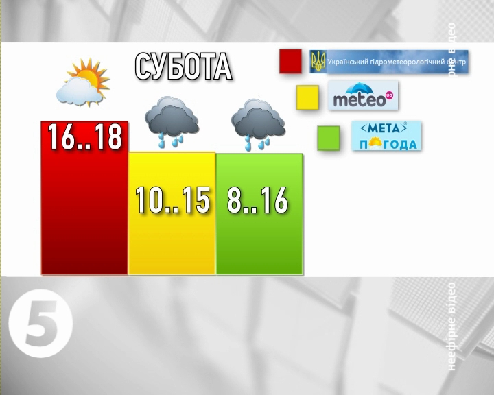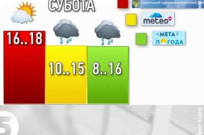Так Гідрометеоцентр на суботу прогнозує у столиці 16-18 градусів вище нуля. І хмарну з проясненням погоду. Натомість два інших Інтернет-ресурси - до 15 і 16 градусів тепла. І прогнозують дощ.