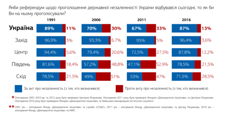 Згідно даних опитування, якби референдум щодо проголошення державної незалежності України відбувався сьогодні, його б підтримали 86,9% українців, проти проголосували б лише 13,1%. На таке запитання українці відповідали у 1991, 2006 та 2011 роках. Показник підтримки незалежності у 2016-му лише трохи нижчий, ніж у 1991 році і значно перевищує дані інших років.