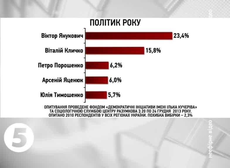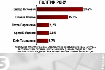 Соціолог: «Отже, чинного главу держави політиком року назвали 23 відсотки українців. За ним, майже із 16-ма відсотками у рейтингу розташувався Віталій Кличко. Понад шість процентів у Петра Порошенка. І майже стільки ж у Арсенія Яценюка. Трохи менше шести відсотків в ув’язненої опозиціонерки Юлії Тимошенко».