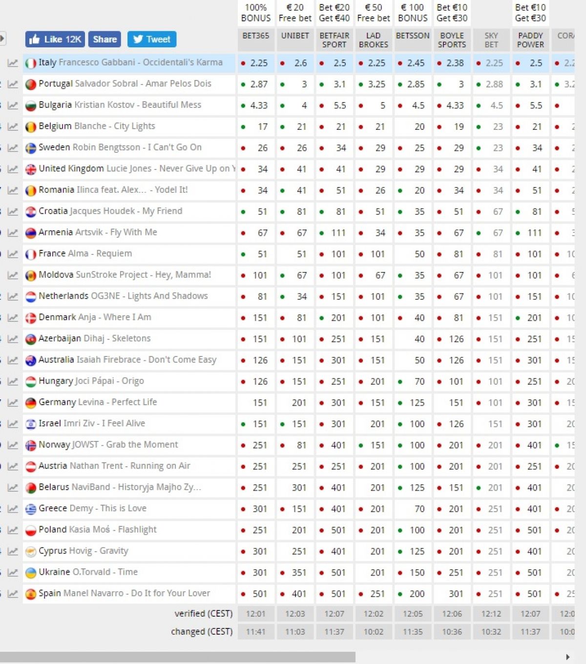 Букмекери прогнозують перемогу у пісенному конкурсі Євробачення-2017 представнику Італії Франческо Габбані з композицією Occidentali's Karmа. Про це повідомляє ЕurovisionWorld.