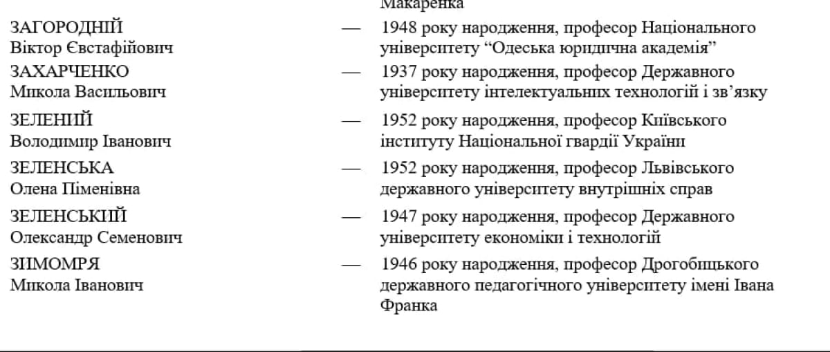 У додатку серед інших прізвищ значиться професор Державного університету економіки та технологій – Олександр Семенович Зеленський.