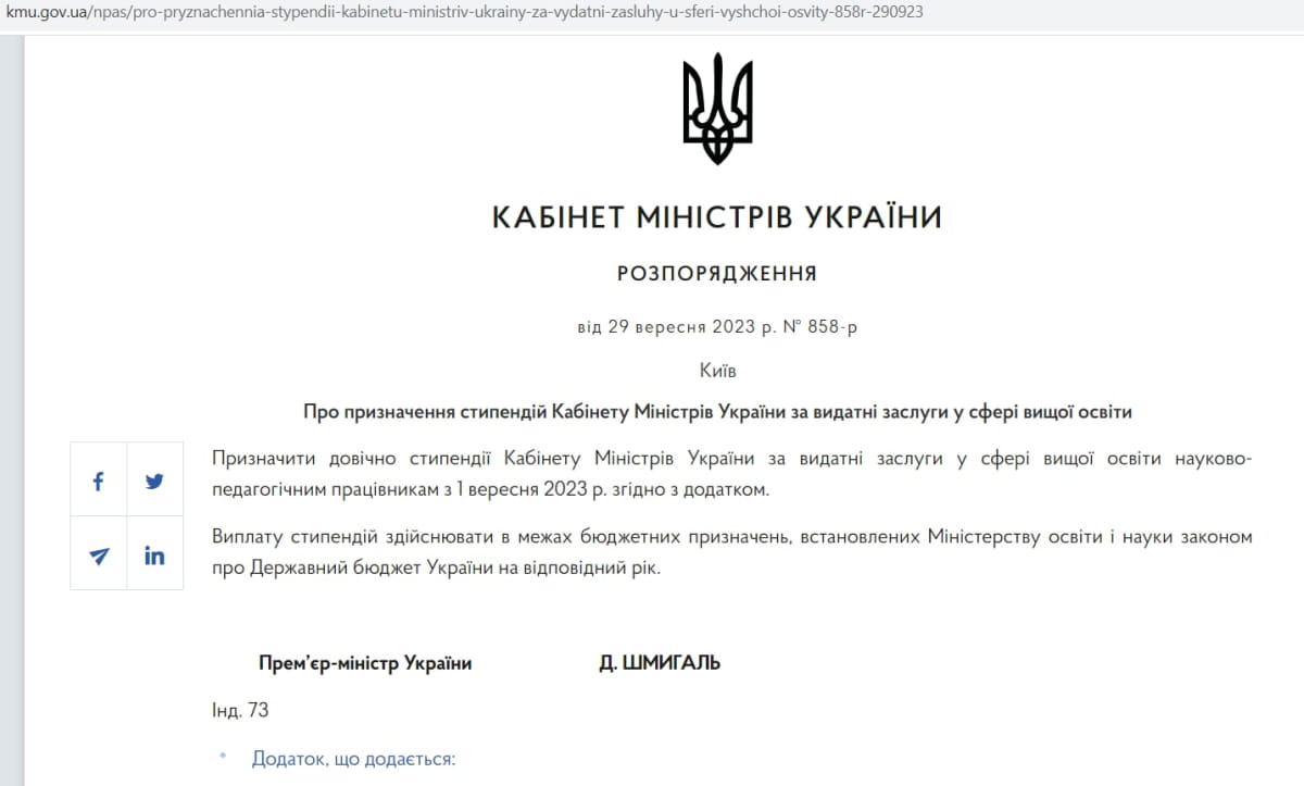 Так, у розпорядженні № 868-р "Про призначення стипендій Кабінету Міністрів України за видатні заслуги у сфері вищої освіти", повідомляється: "Призначити довічно стипендії Кабінету Міністрів України за видатні заслуги у сфері вищої освіти науково-педагогічним працівникам з 1 вересня 2023 р. згідно з додатком. Виплату стипендій здійснювати в межах бюджетних призначень, встановлених Міністерству освіти і науки законом про Державний бюджет України на відповідний рік".