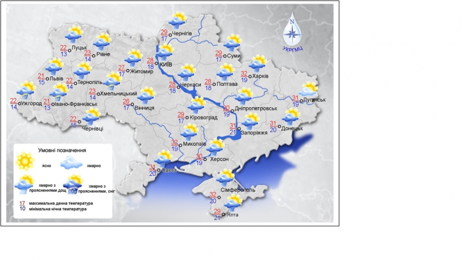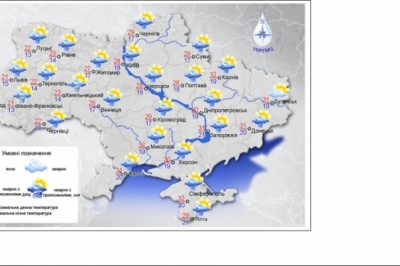 Згідно з повідомленням, завтра в Україні, крім Луганщини, грози, вдень при грозах подекуди град та шквали 15-20 м/с; в західних, північних та більшості центральних областей місцями сильні дощі, вночі у карпатському регіоні дуже сильні дощі.