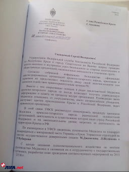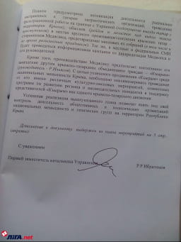 Лист із грифом "секретно" від 28 квітня 2015 року адресовано сепаратисту Сергію Аксьонову. Там йдеться, що керівництво Меджлісу не тільки виступає проти анексії, але і "відмовилося від співпраці, має антиросійські переконання й веде українську пропаганду".