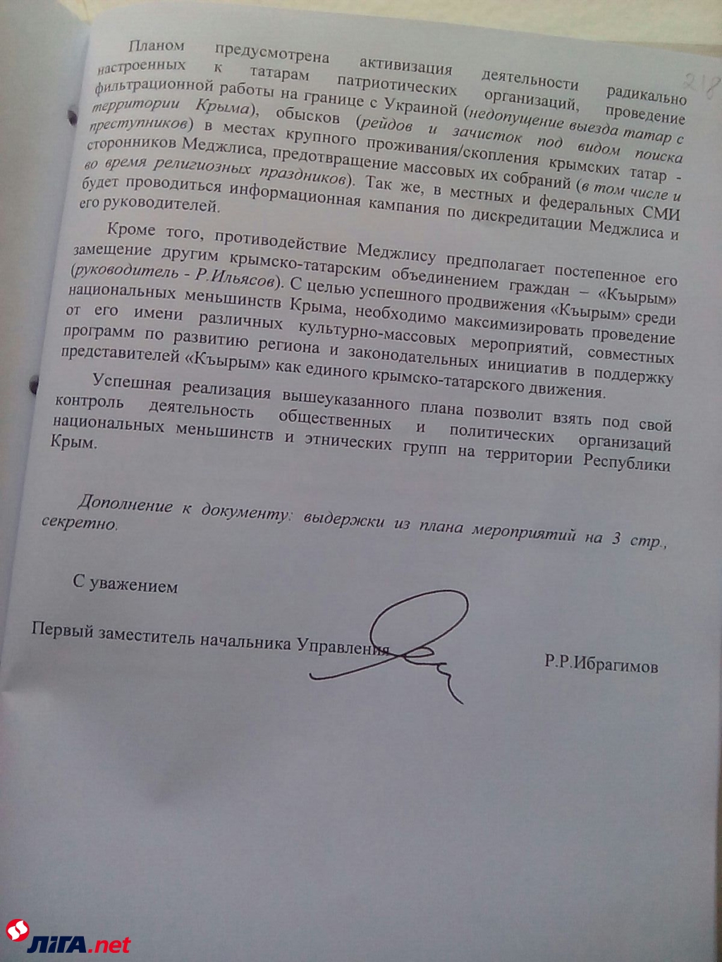 У документі, підписаному першим заступником начальника управління ФСБ в Криму Рустемом Ібрагімовим, йдеться про певний план заходів, метою яких є "психоемоційний вплив на місцеве керівництво Меджлісу й схиляння їх до співпраці з державними органами".