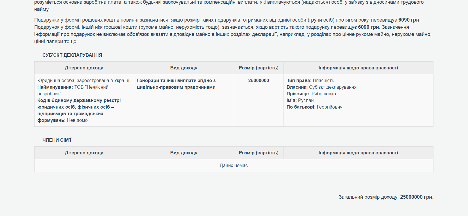 "Сьогодні в системі з'явилася декларація, заповнена невідомою особою від імені Руслана Рябошапки, члена НАЗК, в котрій вказується, що Руслан Рябошапка отримав 25 млн грн. Кожен може зайти на сайт і подивитися, що в системі НАЗК, розробленій фірмою "Міранда" і запущеній під тиском істеричних викриків, є запис про те, що член НАЗК Руслан Рябошапка отримав за 2015 рік", – наголосив Геращенко.