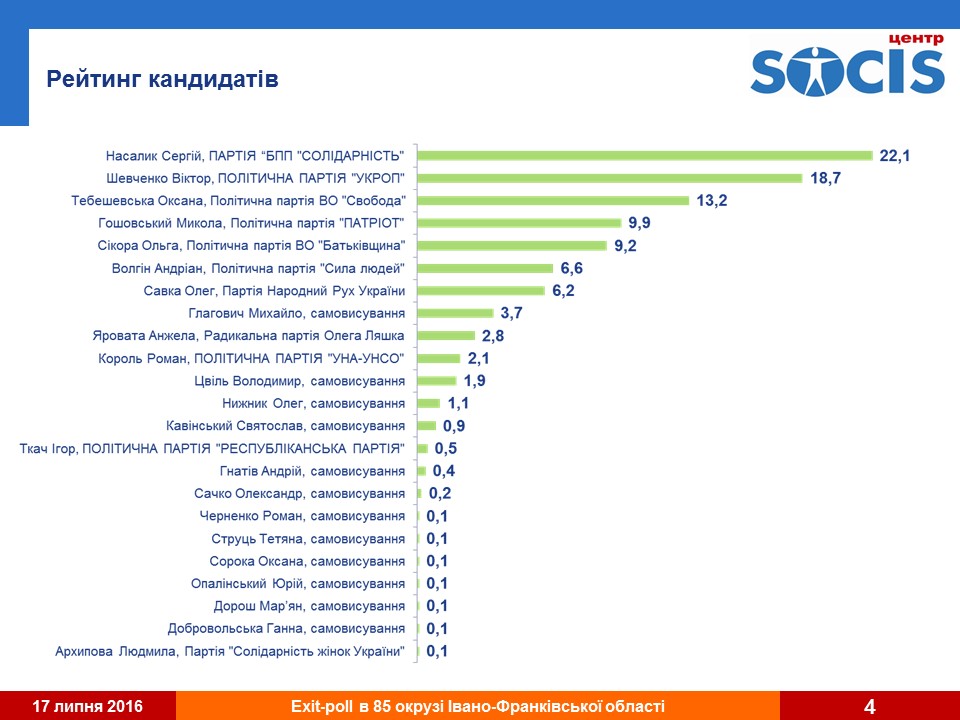 В округ № 85 (Калуш, Івано-Франківська область) лідирують, за результатами опитування, мер Рогатина Сергій Насалик ( "БПП") - 22,1%, член партії "Кріп" Віктор Шевченко -18,7%, член партії ВО " Свобода "Оксана Тебешевская - 13,2%.
