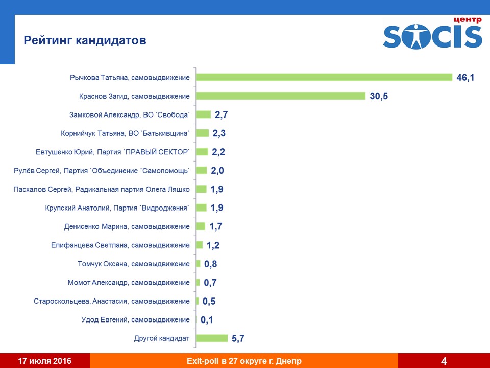 Так, в окрузі №27 (р.Дніпро) лідирує волонтер, радник міністра оборони України Тетяна Ричкова - у неї 46,1%. На другому місці - бізнесмен, депутат Дніпровської міськради Загід Краснов (30,5%). Решта кандидатів відстають зі значним відривом.