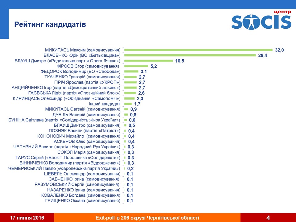 В окрузі №206 (м.Чернігів) лідирує самовисуванець, президент корпорації "Укрбуд", колишній депутат Київради від "УДАРу" Максим Микитась (32%), на другому місці кандидат від партії "Батьківщина" Юрій Власенко (28,4%). Кандидат від Радикальної партії Дмитро Блауш - 10,5%, самовисуванець Єгор Фірсов - 5,2% голосів виборців.
