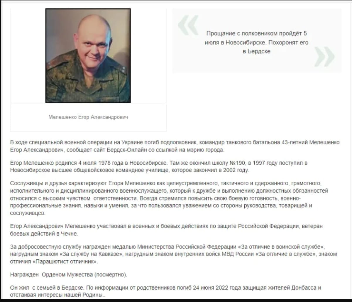 Відомо, що 5 липня у російському місті Бердськ (Новосибірська область) поховали командира танкового батальйону російської армії підполковника Єгора Мелешенка.
