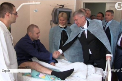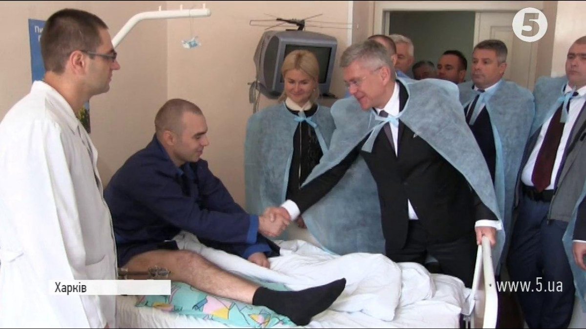 Закордонних гостей поранені бійці зустрічають на лікарняних ліжках. Серед них – армієць 17-ї танкової бригади Олександр Косік. Його ушпиталили після складного поранення ноги, якого зазнав ще наприкінці березня поблизу Троїцького. Сусід по палаті – сапер Григорій Гунько. Саме готується до переведення в інститут протезування. Праву ногу боєць втратив два з половиною місяці тому під час розмінування Балаклії.