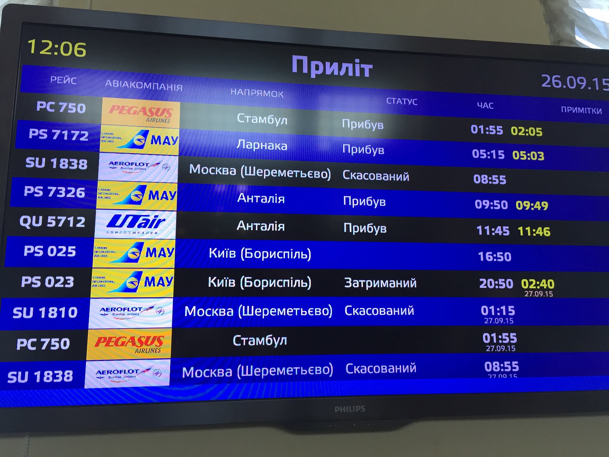 Про це повідомляє "УНІАН". Зокрема, як зазначається на електронних табло аеропортів, сьогодні й завтра три рейси скасовані до Харкова, ще один – в Одесу. Це сталося після того, як вчора, 25 вересня, Кабмін прийняв рішення про заборону польотів російських авіакомпаній, в першу чергу компаній "Аерофлот" і "Трансаеро" до України.