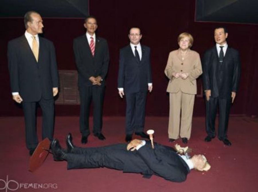 Нагадаємо, 5 червня активістка Femen увірвалася в зал паризького музею Гревен, де виставлені воскові зображення глав держав, перекинула фігуру російського лідера і пронизала її колом.