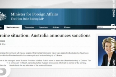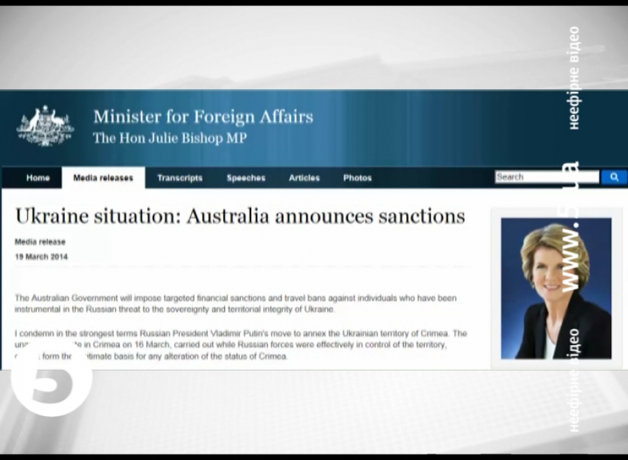 Джулі Бішоп, міністр закордонних справ Австралії: "Австралійський уряд запровадить адресні фінансові санкції та обмеження на в’їзд для людей, які посприяли порушенню територіальної цілісності України з боку Росії. Дії Кремля - це відверте нехтування міжнародних законів. Референдум, який відбувся в Криму - не можна вважати чесним, його провели у момент, коли півострів вже був фактично окупованим. Я в найжорсткіших термінах засуджую застосування сили проти України та її громадян. Ситуація у регіоні залишається небезпечною і може перерости у відкрите збройне протистояння. Про це свідчить і загибель українського військового в Криму".