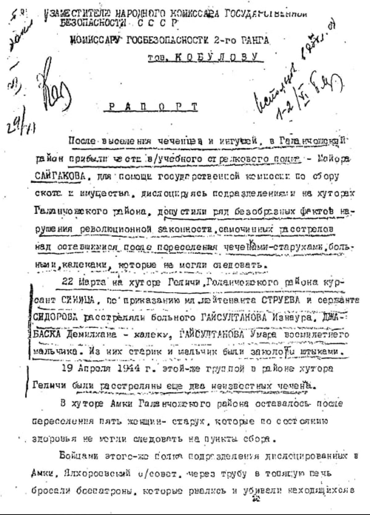 Найголовніший – постанова президії Верховної Ради СРСР від 7 березня 1944-го про ліквідацію Чечено-Інгушської автономної республіки і депортацію – дослівно: "Усіх чеченців та інгушів". За що? Цитуємо: "Багато чеченців та інгушів зрадили батьківщині, переходили на бік фашистських окупантів, вступали у загони диверсантів..."