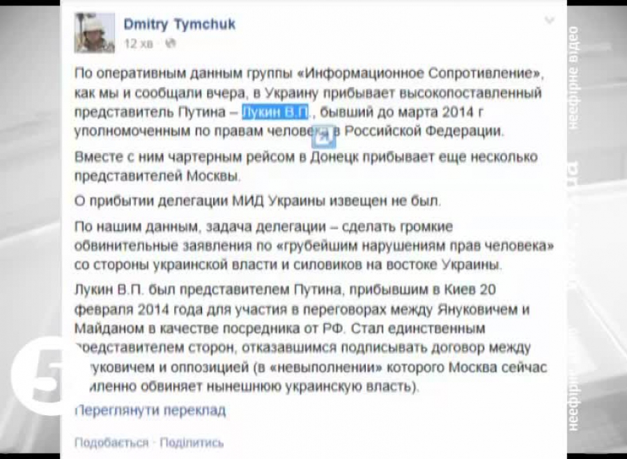До Донецька чартерним рейсом вилетів високопоставлений представник російського президента, колишній уповноважений Росії з прав людини Володимир Лукін разом з цілою групою московських чиновників. Про це на своїй сторінці в Фейсбук написав керівник групи Інформаційний спротив - Дмитро Тимчук.