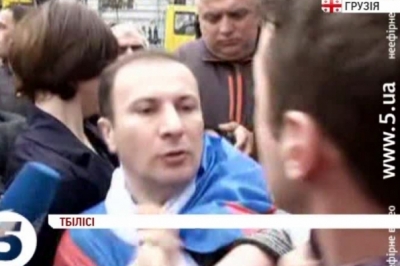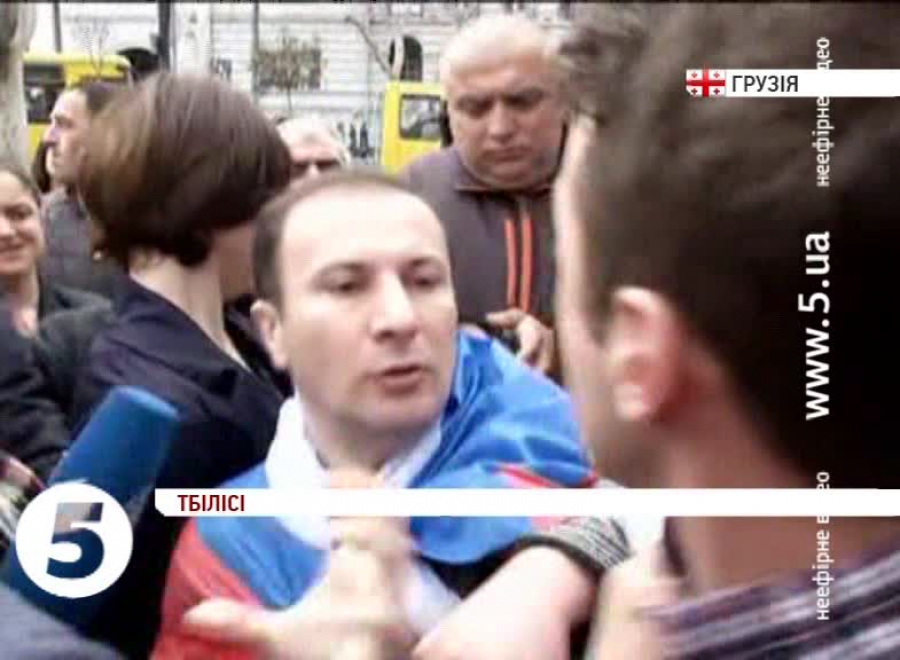 Провела зібрання також і неурядова організація "Земля - наш дім". Активісти заявили, що підтримують дії Росії на території України і вимагали на знак солідарності запровадити санкції і проти них самих. Учасників антиросійської акції - прийшло значно більше. На мітингу вони нагадали про окупацію Росією Абхазії та Південної Осетії. Врешті, обидві групи мітингувальників - побилися між собою. Двох людей затримали правоохоронці.