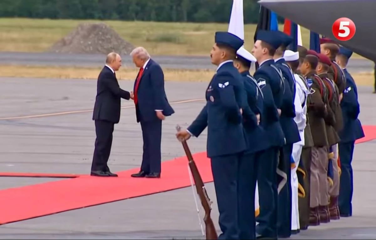 У США на Алясці зустрілися 15 серпня президент США Дональд Трамп і російський диктатор путін. Американський лідер потиснув руку путіну, який вбивав і вбиває тисячі людей. Після цього вони посміхнулись і пішли по червоній доріжці разом. Далі лідери США і рф сіли в одне авто і поїхали до місця переговорів.