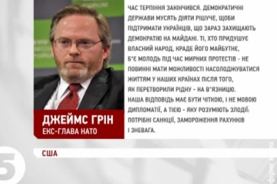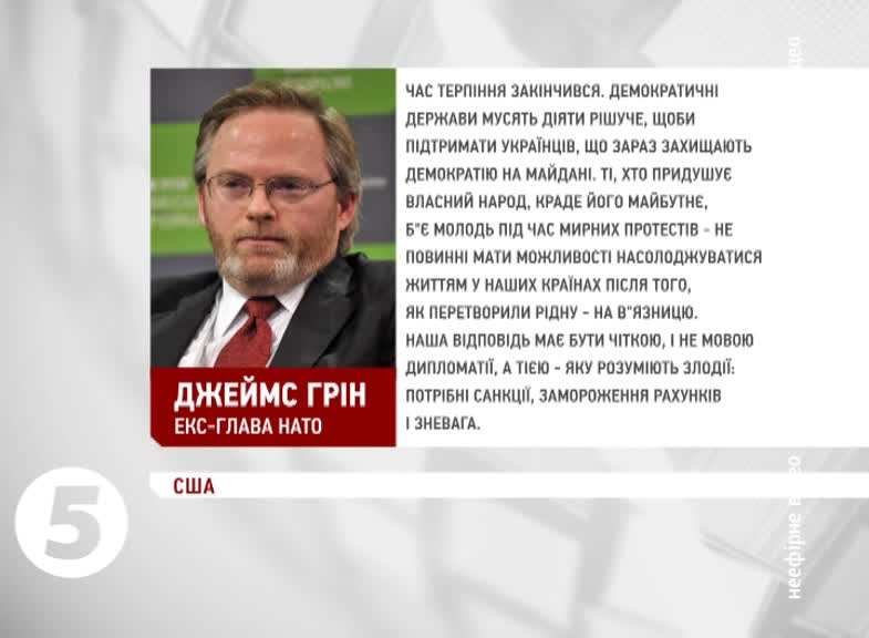 Джеймс Грін, екс-глава НАТО: «Час терпіння закінчився. Демократичні держави мусять діяти рішуче, щоби підтримати українців, що зараз захищають демократію на Майдані. Ті, хто придушує власний народ, краде його майбутнє, б`є молодь під час мирних протестів не повинні мати можливості насолоджуватися життям у наших країнах після того, як перетворили рідну на в`язницю. Наша відповідь має бути чіткою, і не мовою дипломатії, а тією, яку розуміють злодії: потрібні санкції, замороження рахунків і зневага.