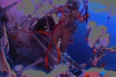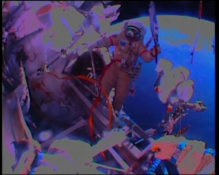 Двоє росіян передали смолоскип одне одному. Усе це - знімали зовнішні камери МКС та їхні колеги крізь ілюмінатори. Щоби факел не відлетів далеко, до нього приладнали страхувальний трос. Тривав цей етап Естафети близько години. Факел, як вже заведено під час російської олімпійської естафети, не горів. Після перфомансу космонавти повернулись до своїх звичних клопотів на орбіті.
