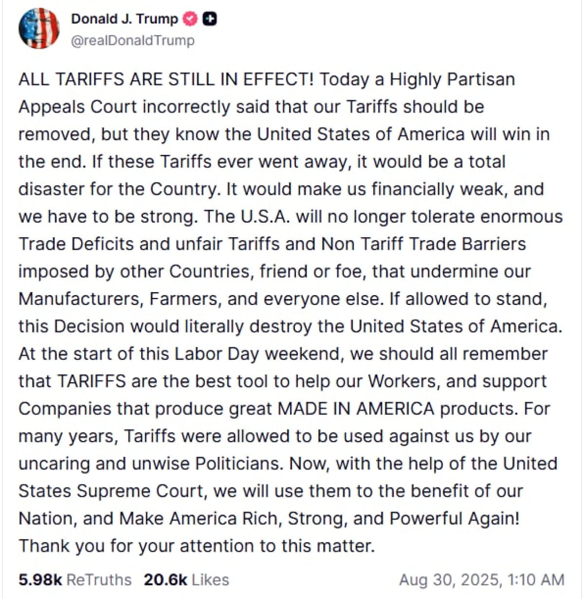 "Сьогодні Апеляційний суд, який відзначається високою партійною прихильністю, помилково заявив, що наші тарифи повинні бути скасовані, але вони знають, що Сполучені Штати Америки в кінцевому підсумку переможуть. Якщо ці тарифи коли-небудь зникнуть, це буде справжньою катастрофою для країни", – заявив він.