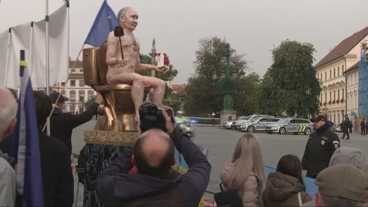 Статуя кремлівського диктатора біля Празького граду, де відбувався саміт. Вона зображує голого путіна, який сидить на золотому унітазі. У руці тримає закривавлену модель пральної машини. Біля його підніжжя сидить білоруський диктатор Лукашенко. Самі демонстранти наголошують – єдиний спосіб завершити цю війну – надати Україні якомога більше важкого озброєння, а також – скасувати право вето у ЄС – щоби жодна країна не могла блокувати антиросійські санкції та постачання озброєння Києву.
