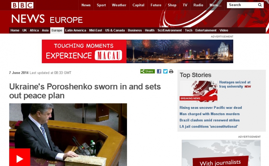 Зокрема, британський телеканал ВВС та американський CNN транслювали інавгурацію Порошенка наживо, на сайті ресурсів інформація про церемонію оновлювалася щохвилини.