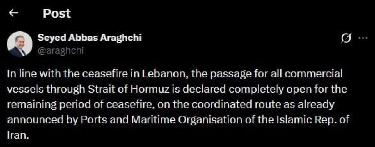 "У зв'язку з припиненням вогню в Лівані, прохід для всіх комерційних суден через Ормузьку протоку оголошено повністю відкритим на решту періоду перемир'я – за узгодженим маршрутом", – повідомив він.